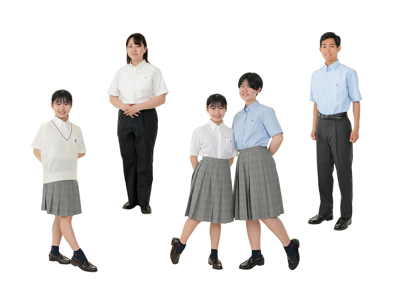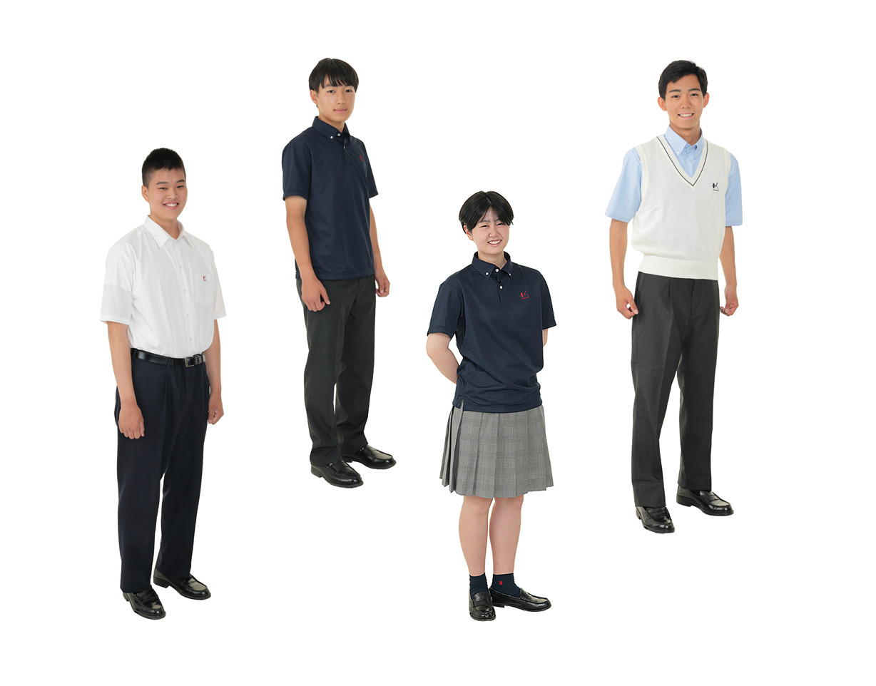 正装は男子は、紺のスラックス。女子はブルーのリボンにブルーのチェックスカート。